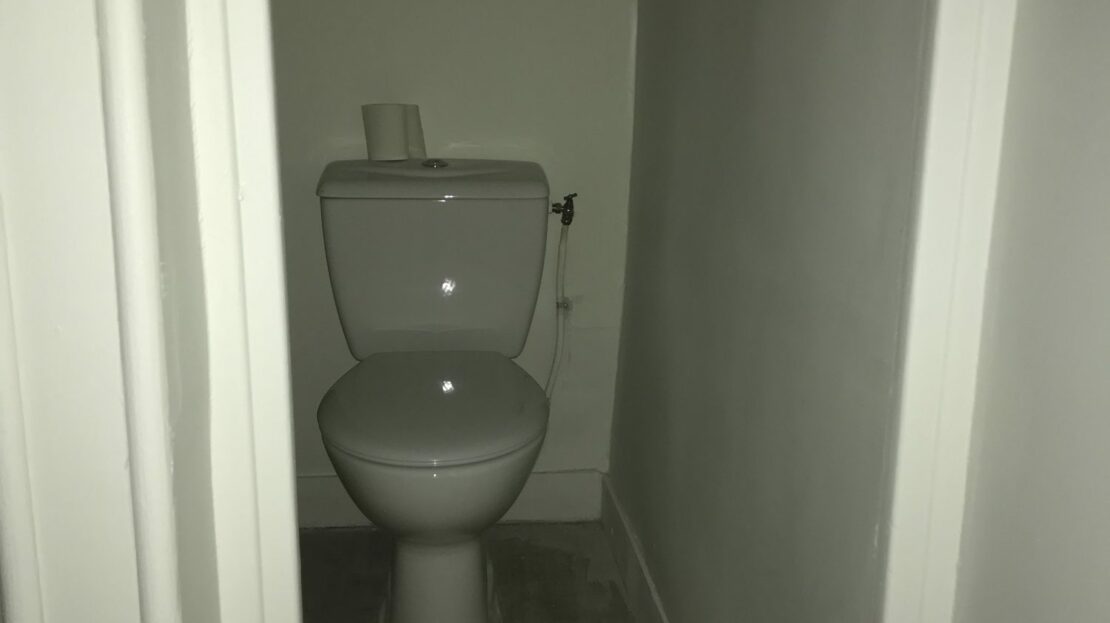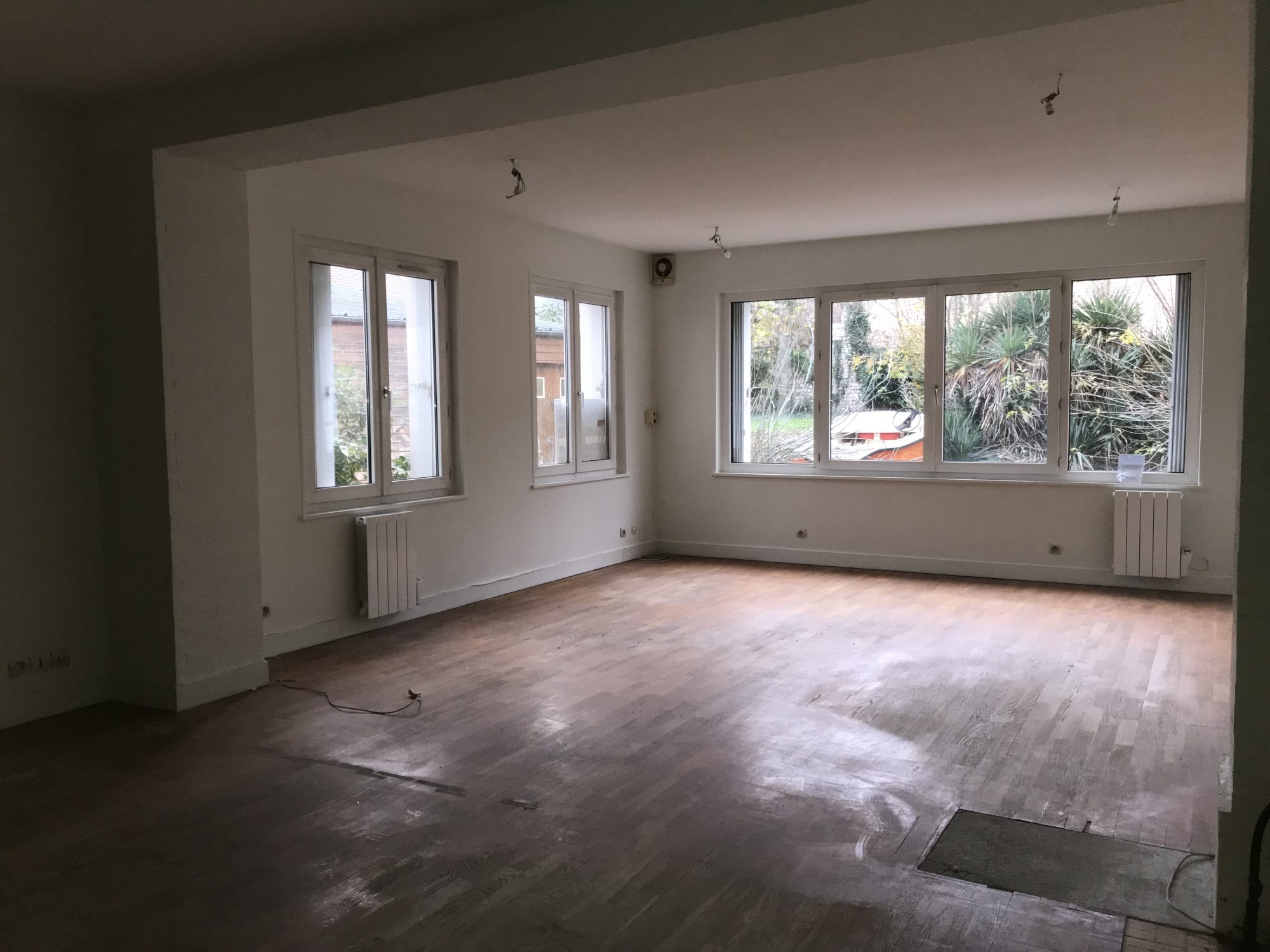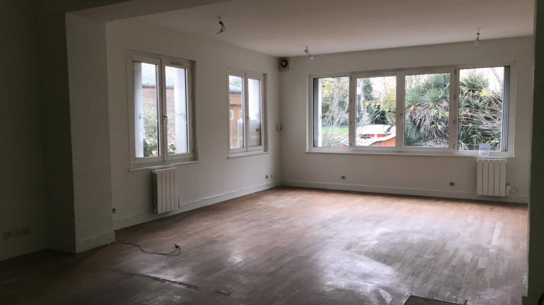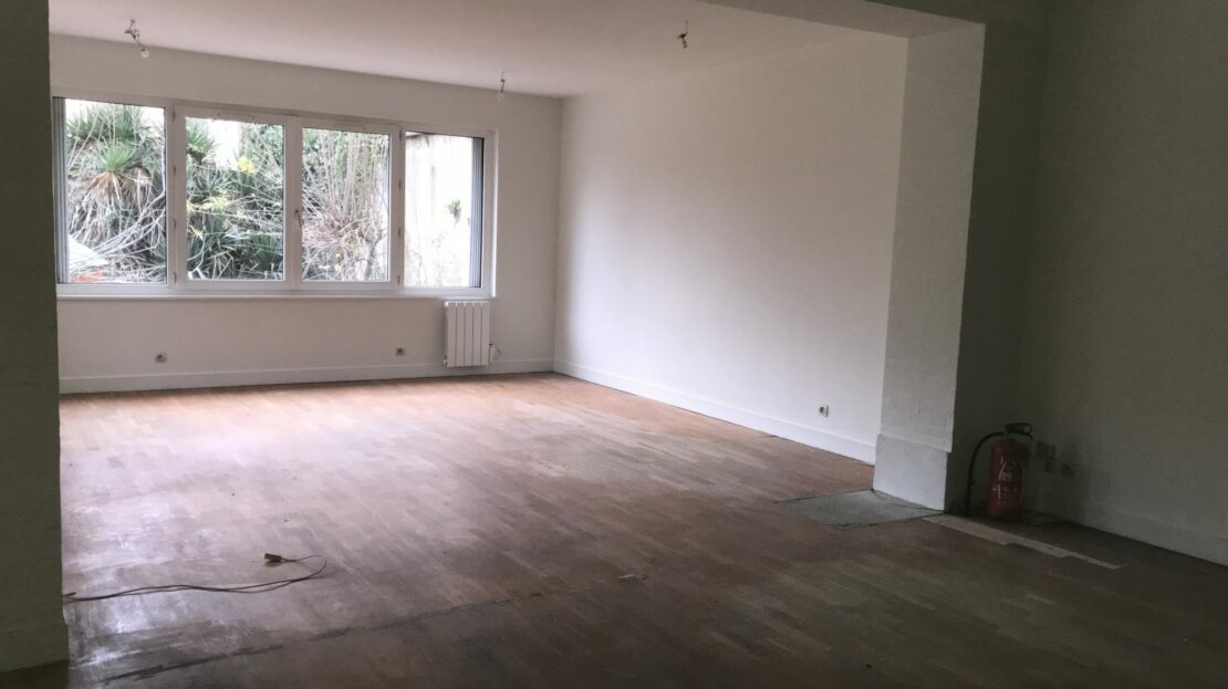 une grande pièce parquetée de 45 m2 environ, un autre bureau de 15 m² et un wc avec lave-mains