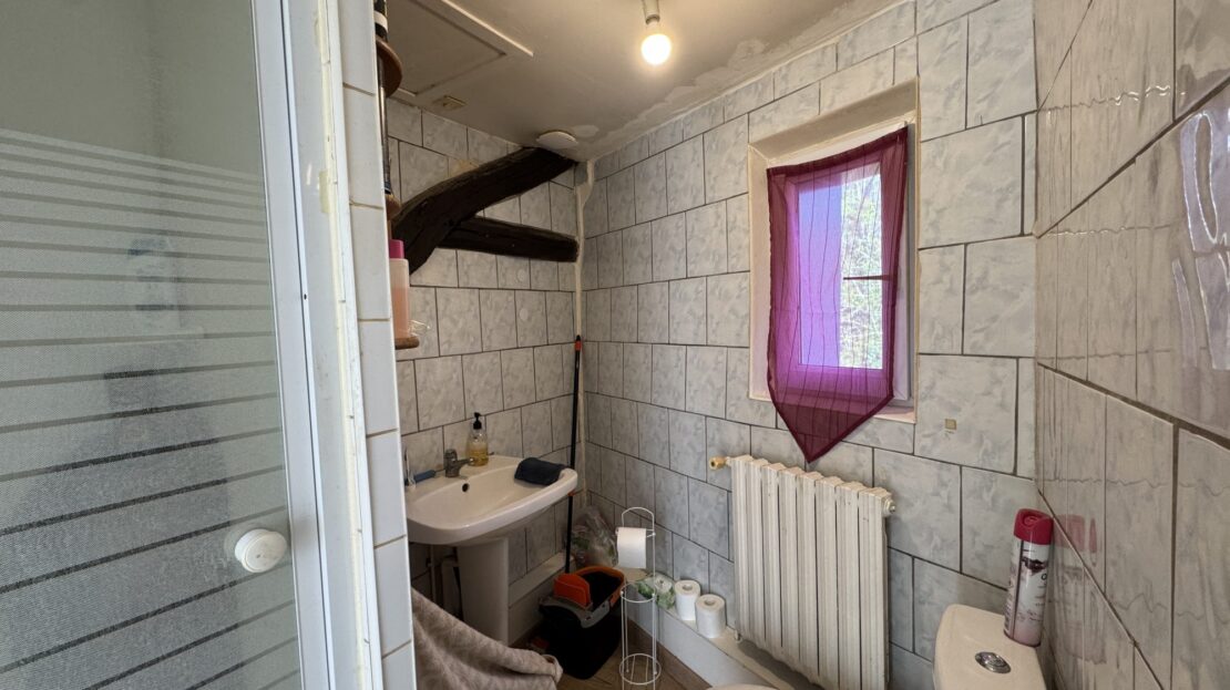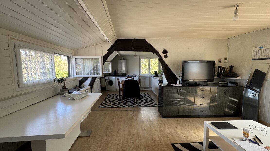 Cage d’escalier, entrée, séjour/salon, cuisine ouverte, chambre, dégagement et salle de douche avec WC.