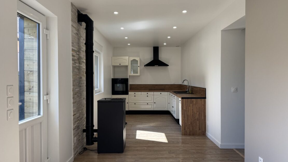 Entrée sur pièce de vie (poêle à granules) avec cuisine entièrement aménagée, dégagement, deux chambres, une salle de douches et WC indépendant.