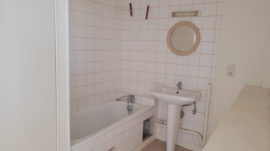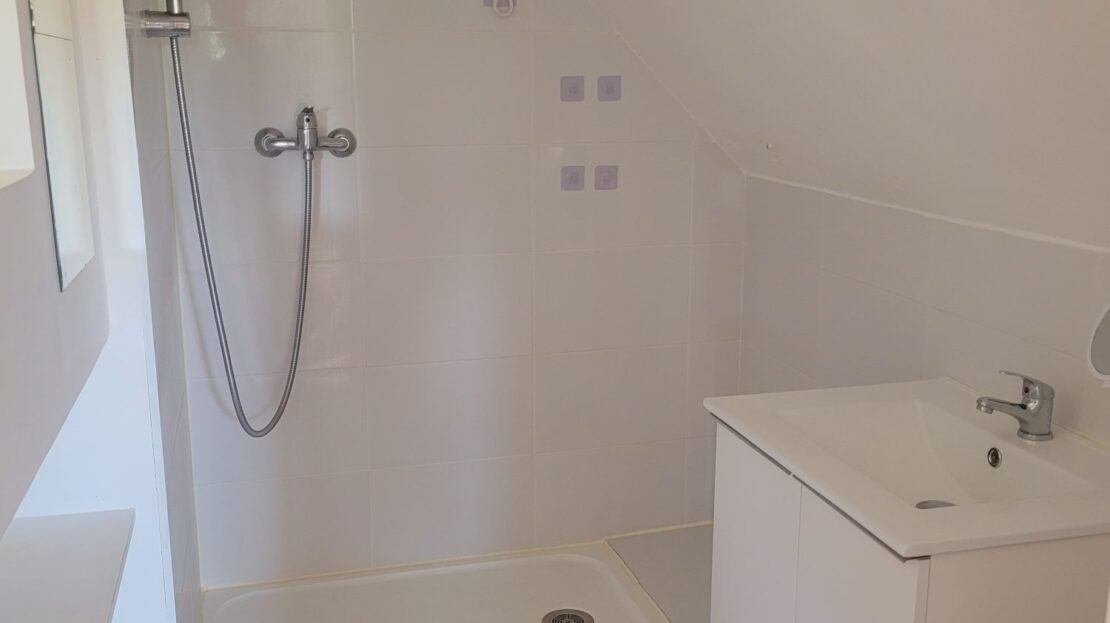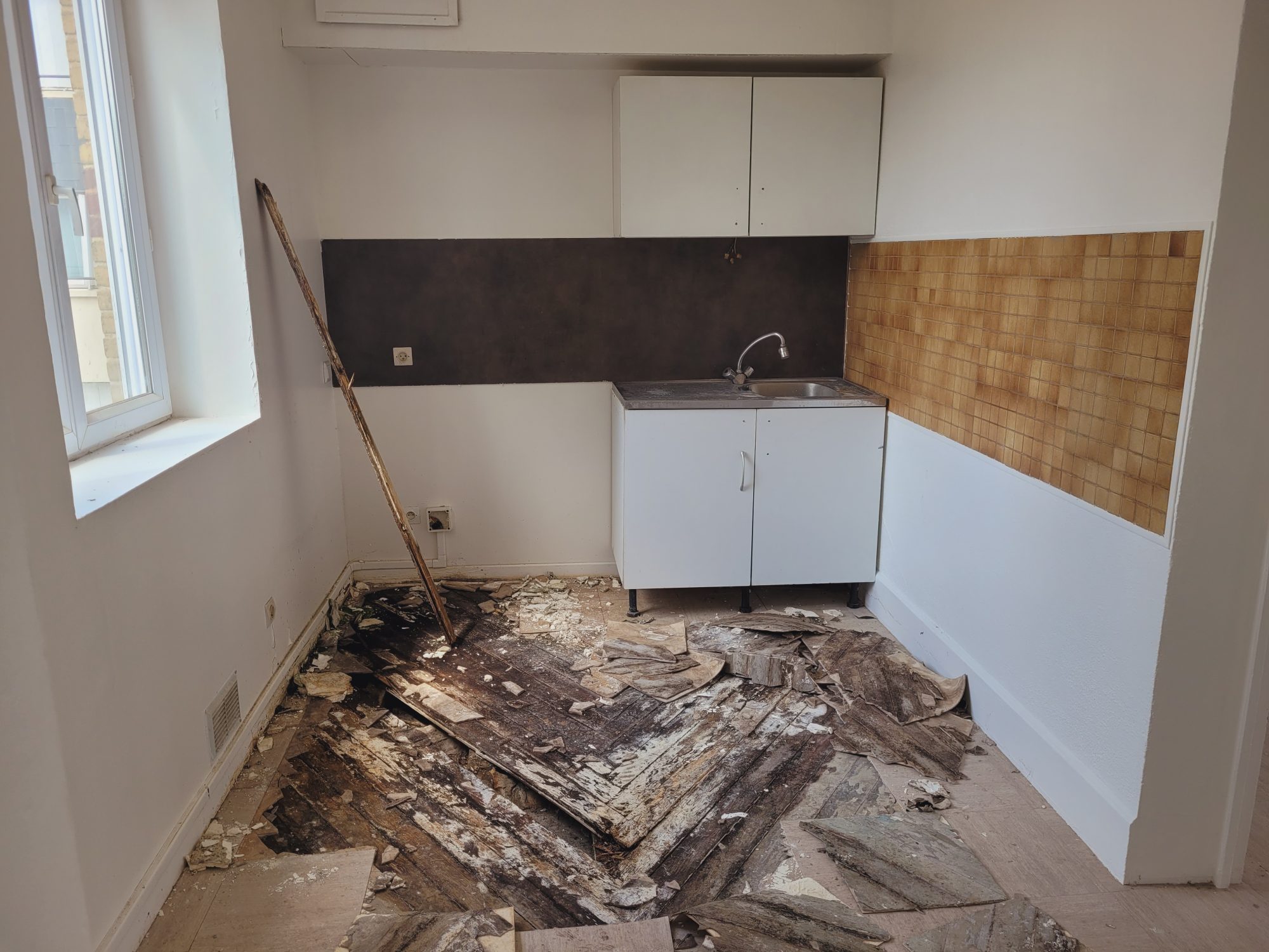 – Au premier étage, un appartement de type F2 d’une surface de 53,20m² comprenant : hall d’entrée, cuisine, salle/salon, une autre petite chambre, salle de bains avec WC.