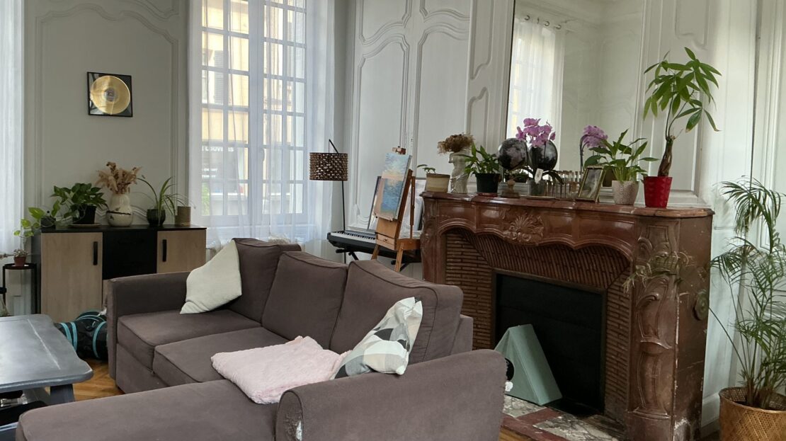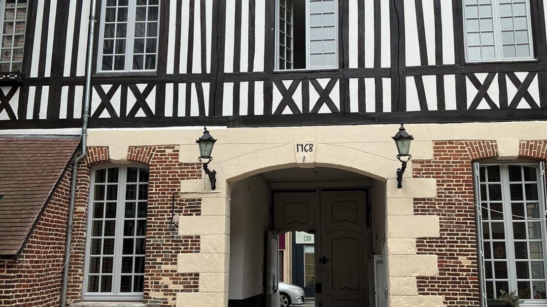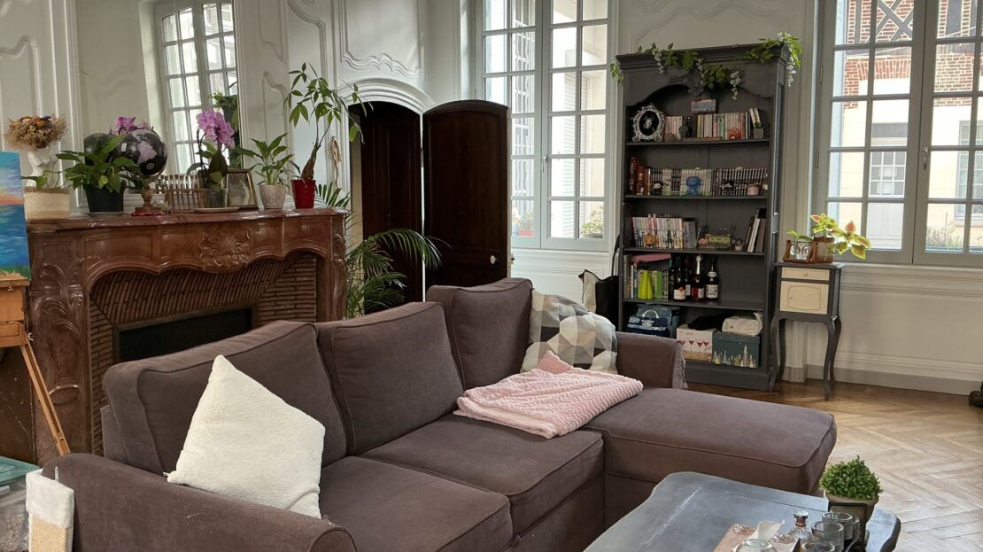 louviers centre, dans très belle résidence pleine de charme avec une cour intérieure, bel appartement de 66.73 m2 situé en rez de chaussée : une belle pièce de vie avec parquet ancien, boiseries et cheminée décorative, cuisine aménagée, deux chambres, salle de douche récente avec wc.