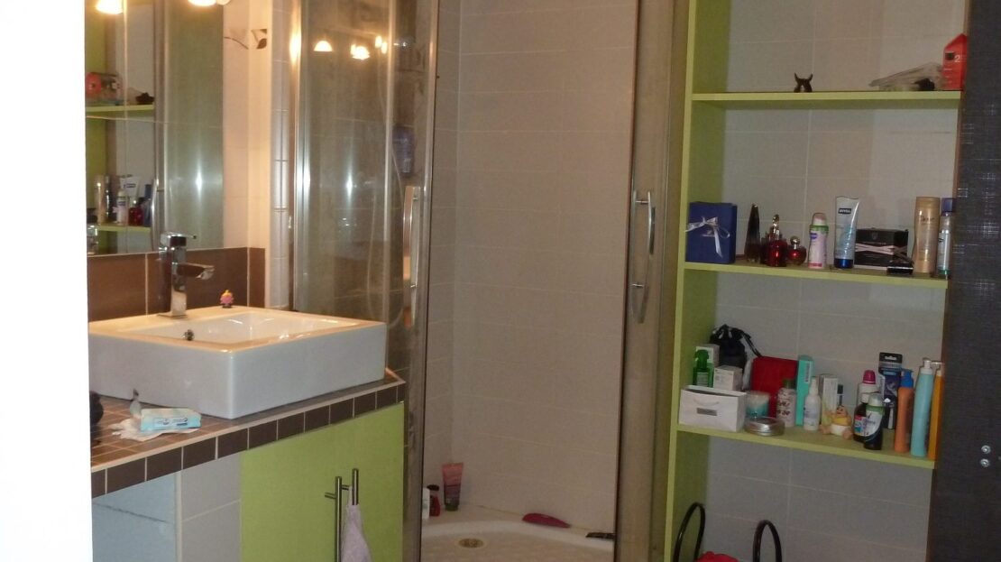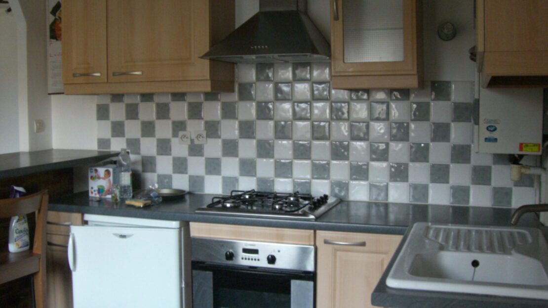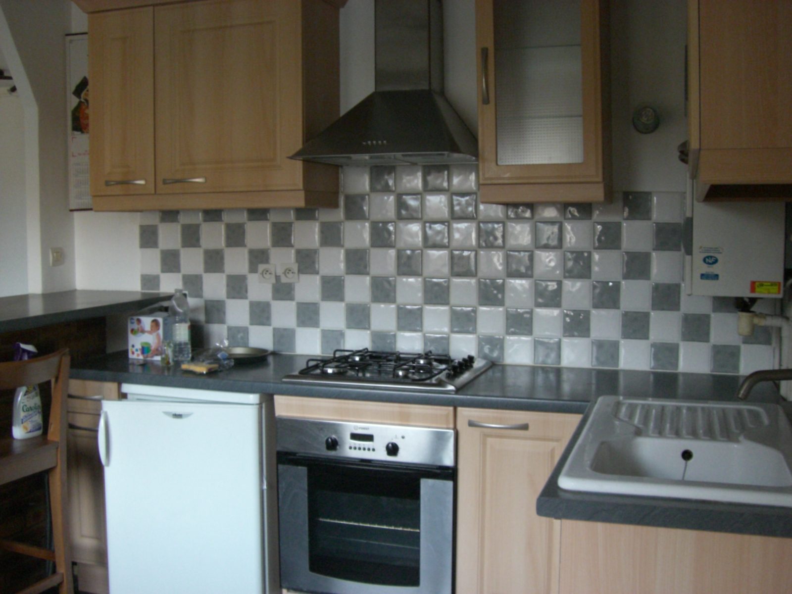entrée dans séjour ouvert sur cuisine équipée d’une hotte de cuisson, une plaque 4 feux gaz, un réfrigérateur, salle de douche avec wc.