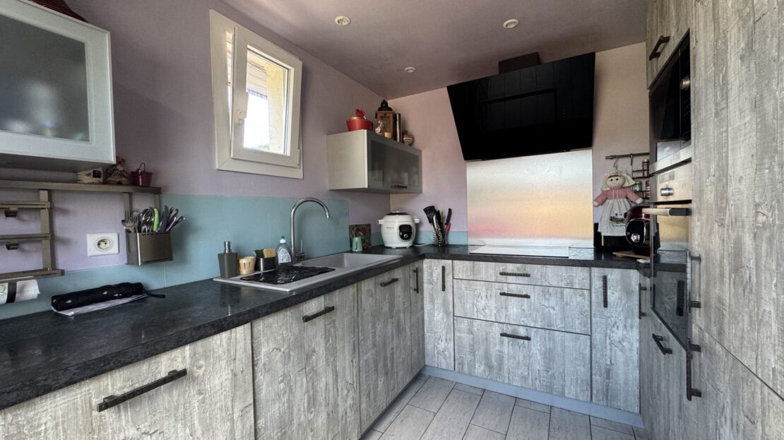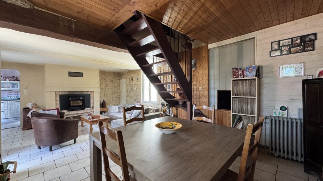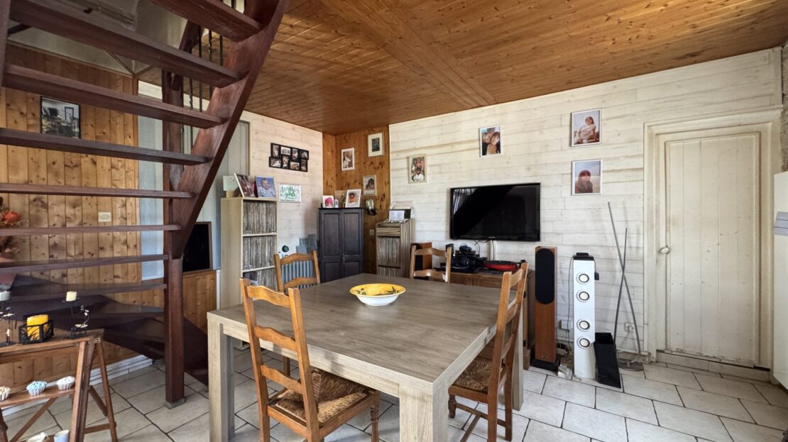 Au rez-de-chaussée une cuisine aménagée indépendante, un séjour/salon avec poêle à granules, une chambre, une salle de douche avec WC.
