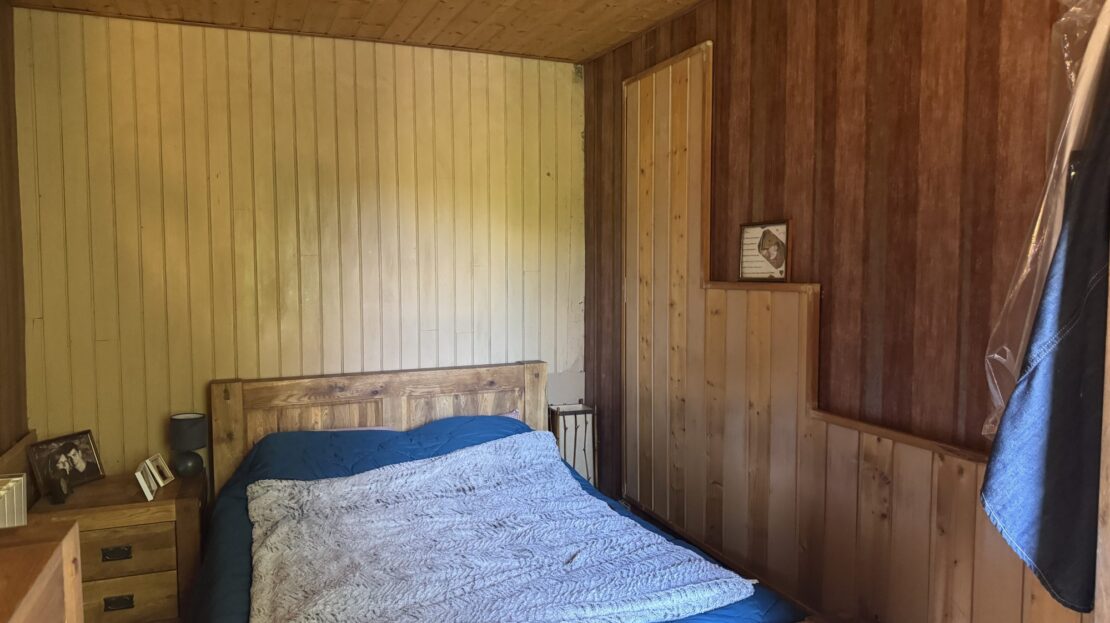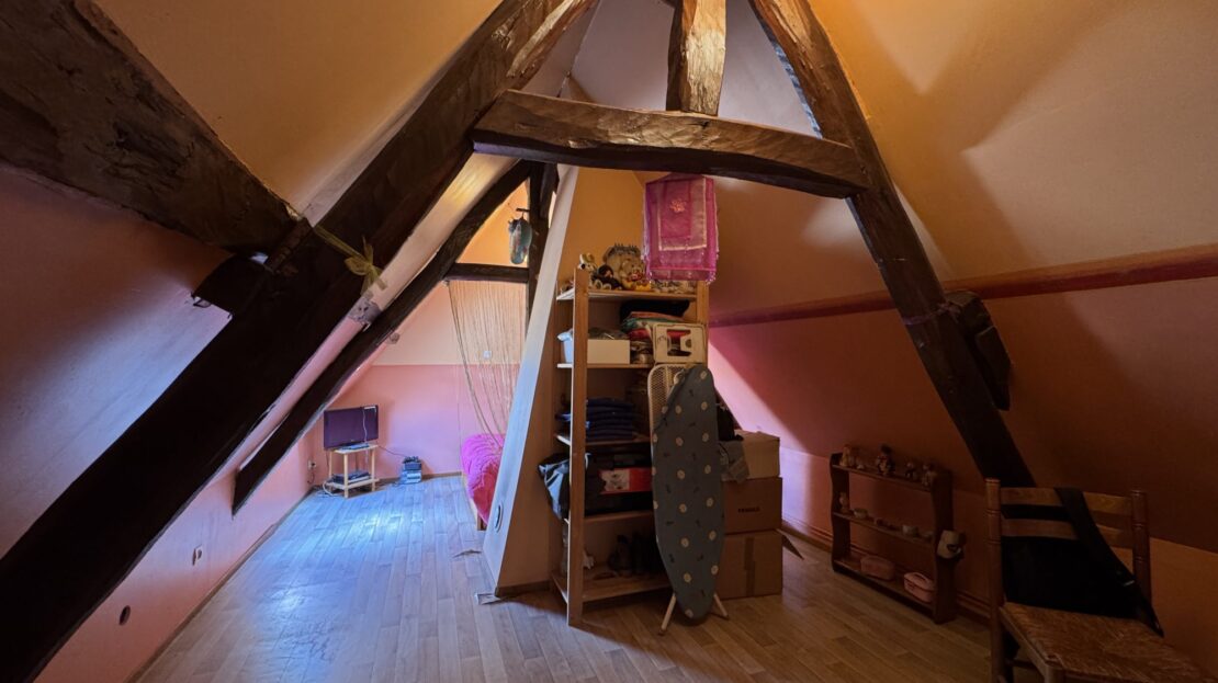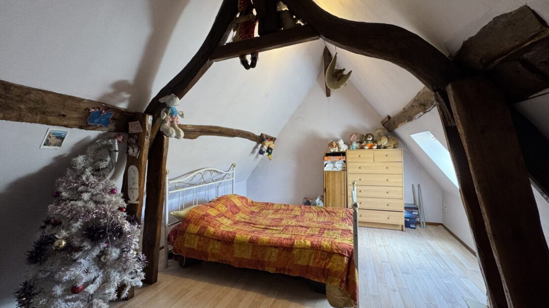 À l’étage, un palier desservant deux chambres, dont une avec coin bureau.