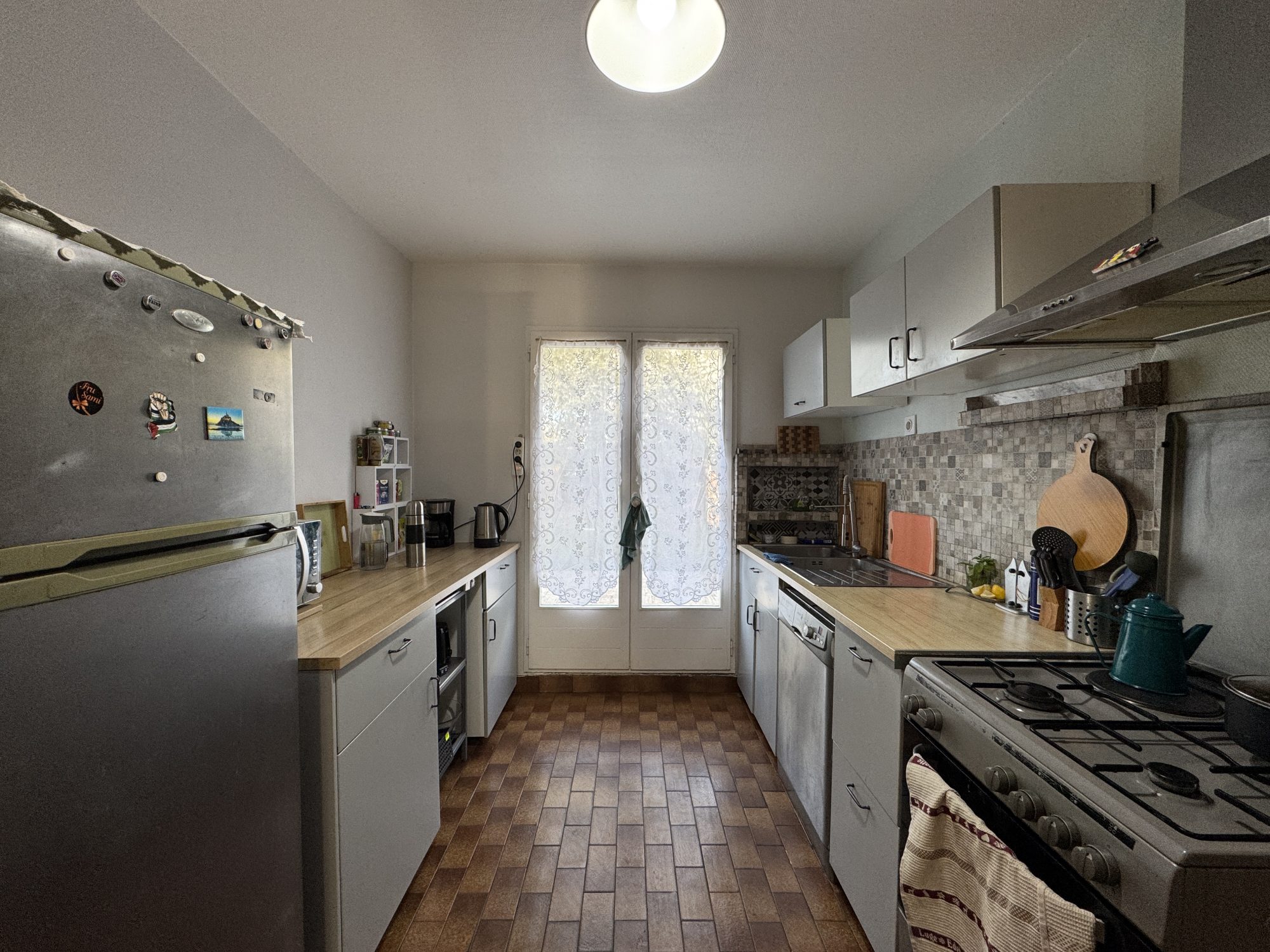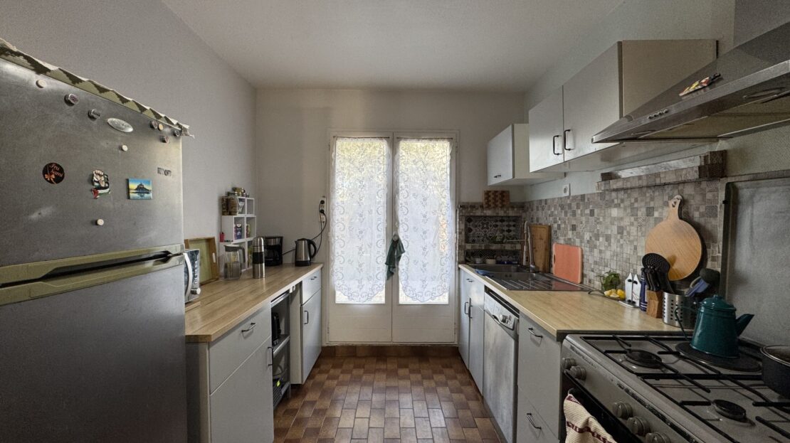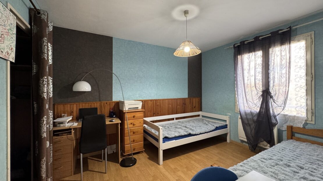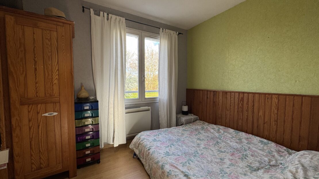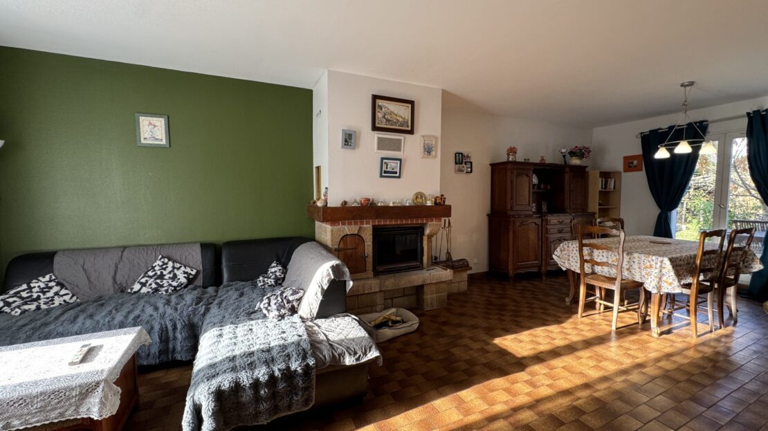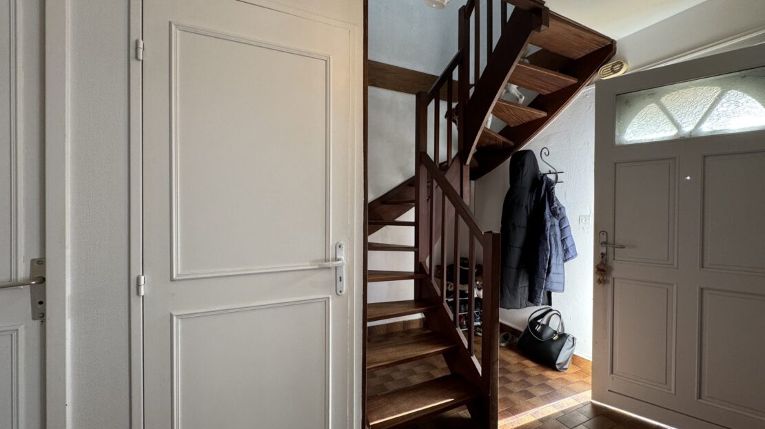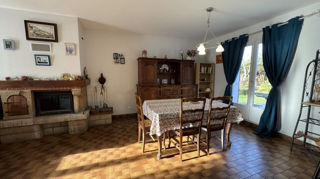 La maison se compose d’une entrée avec rangement, d’une belle pièce à vivre de 32 m² avec lumière traversante et cheminée avec insert, d’une cuisine avec cellier et accès au garage, ainsi que de WC indépendant.À l’étage, le couloir dessert trois chambres, une salle de bains et une salle d’eau avec WC.