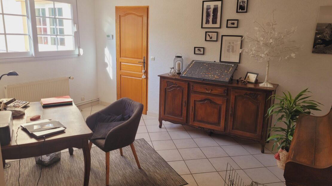 Vous trouverez au rez-de-chaussée une entrée avec placard, une cuisine aménagée et équipée ouverte, une salle à manger avec cheminée, un salon et un bureau. une pièce à aménager dans laquelle se trouve un point d’eau pouvant être transformé en chambre, ainsi qu’une buanderie et un wc.