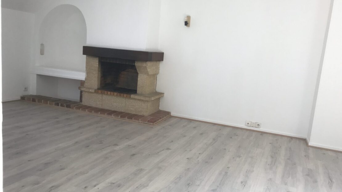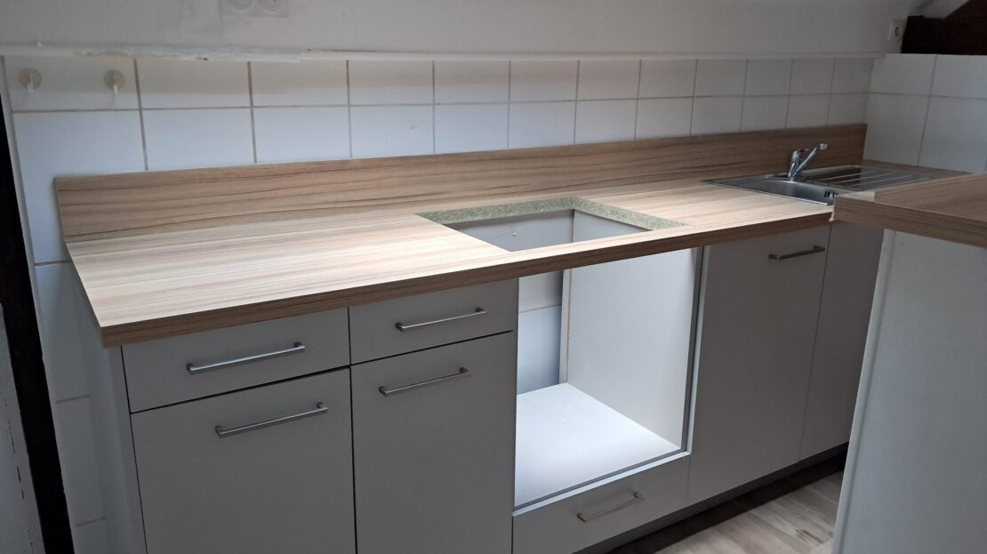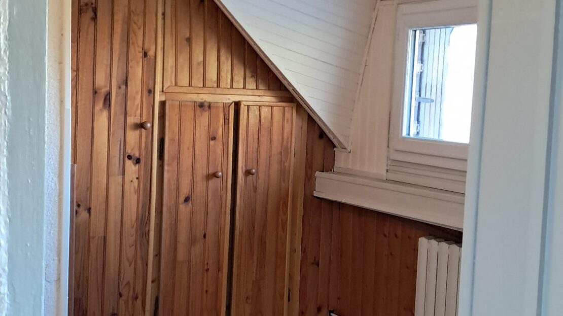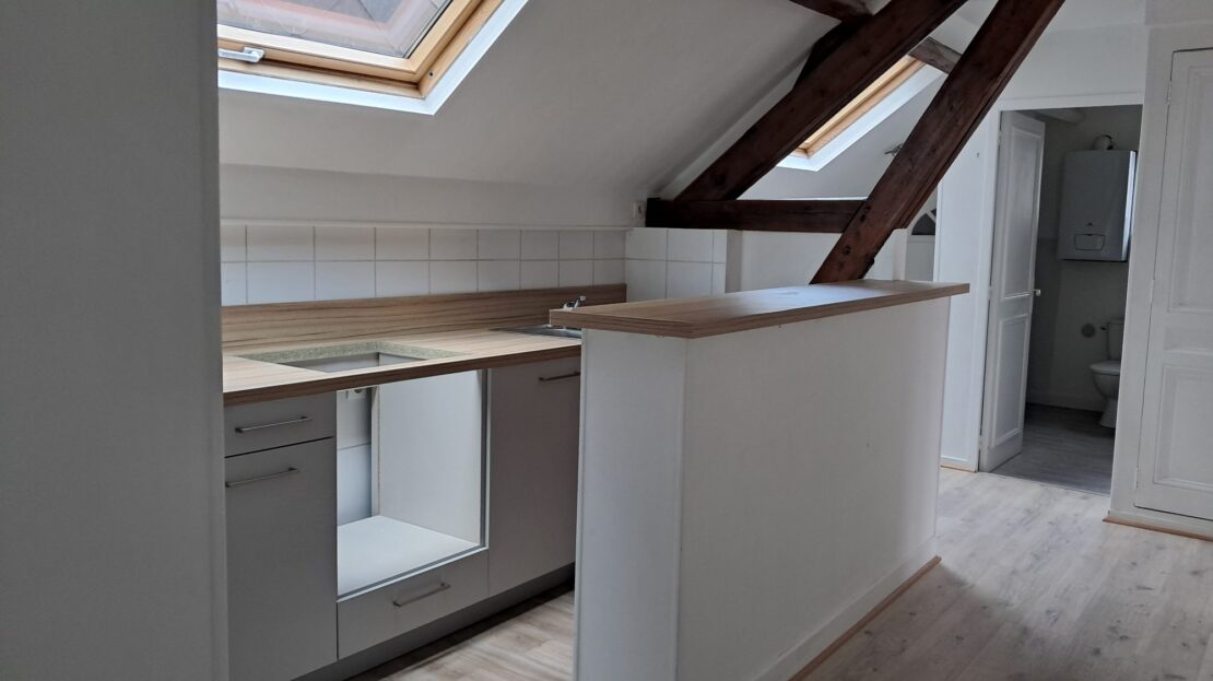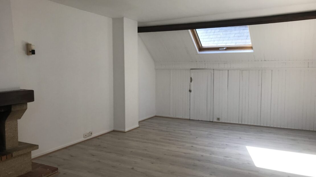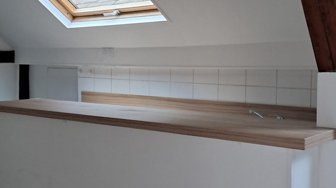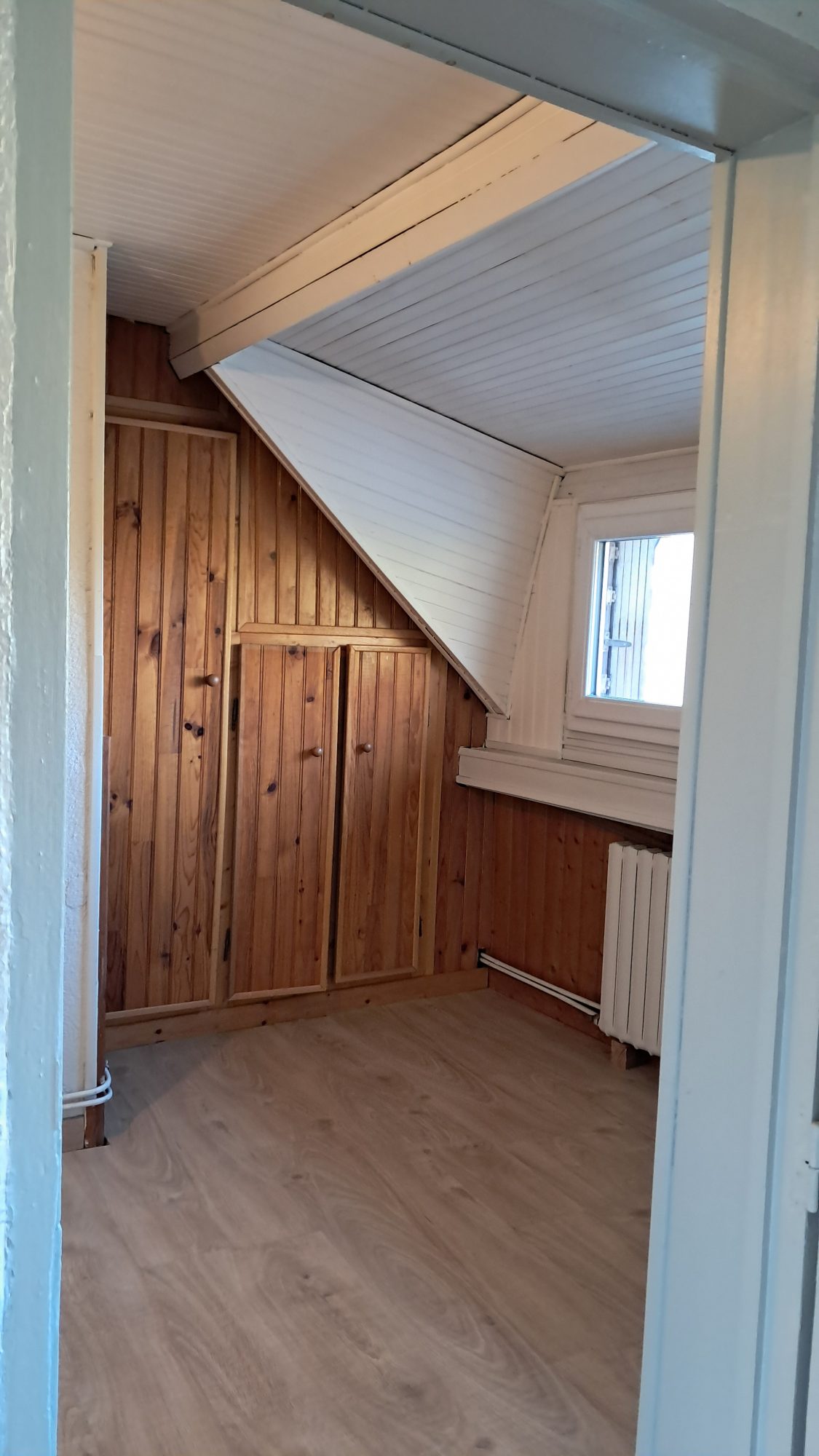 Escalier d’accès d’entrée, cuisine aménagée neuve, séjour salon très lumineux avec cheminée décorative, deux belles chambres dont une avec un placard, salle d’eau avec wc.