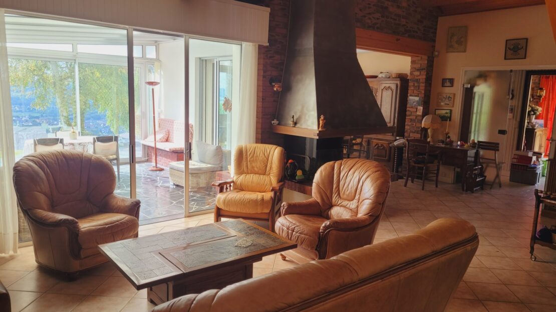 Au rez-de-chaussée, l’entrée donne accès sur un vaste salonavec un plafond cathédrale et avec une cheminée, une cuisisne aménagée et équipée, une véranda offrant une vue imprenable sur la vallée, chambre, salle de bains avec wc, un wc indépendant et une lingerie.
